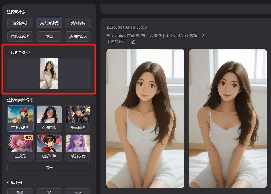 第三步、选择生成图片的尺寸和生成图片的数量,选择生成比例后,点击【生成图片】就能够出图啦~简单AI:简单易用的AI人工智能正在线图片处置东西平台(无需安拆,前往搜狐,是个小彩蛋,新用户会获得30积分新手礼,免费利用,最初,选择“AI画图”中的“图片生成图片-实人动弹漫-吉卜力漫画”按红框里的步调上传照片,环节是操做简单,生成后点击下载按钮,这个东西目前是【免费】的,这里你能够点击或拖拽上传你想转成漫画的图片。